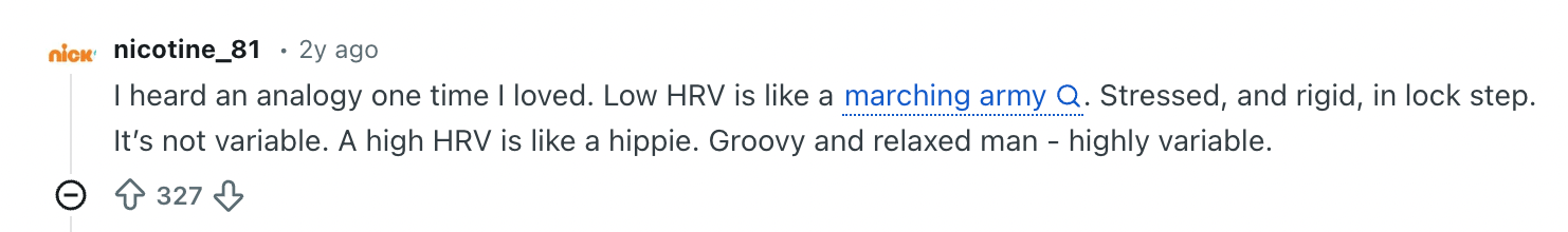 Ultimately, what matters here isn’t avoiding stress altogether—but how quickly you recover from it. As Marco Altini (really the preeminent voice on HRV) told our friends at InsideTracker, “Stress can be good, and sometimes it's essential. The point is not to avoid all stressors, but rather to put yourself in a state where you bounce back very quickly." I also like how this rando put it on Reddit: